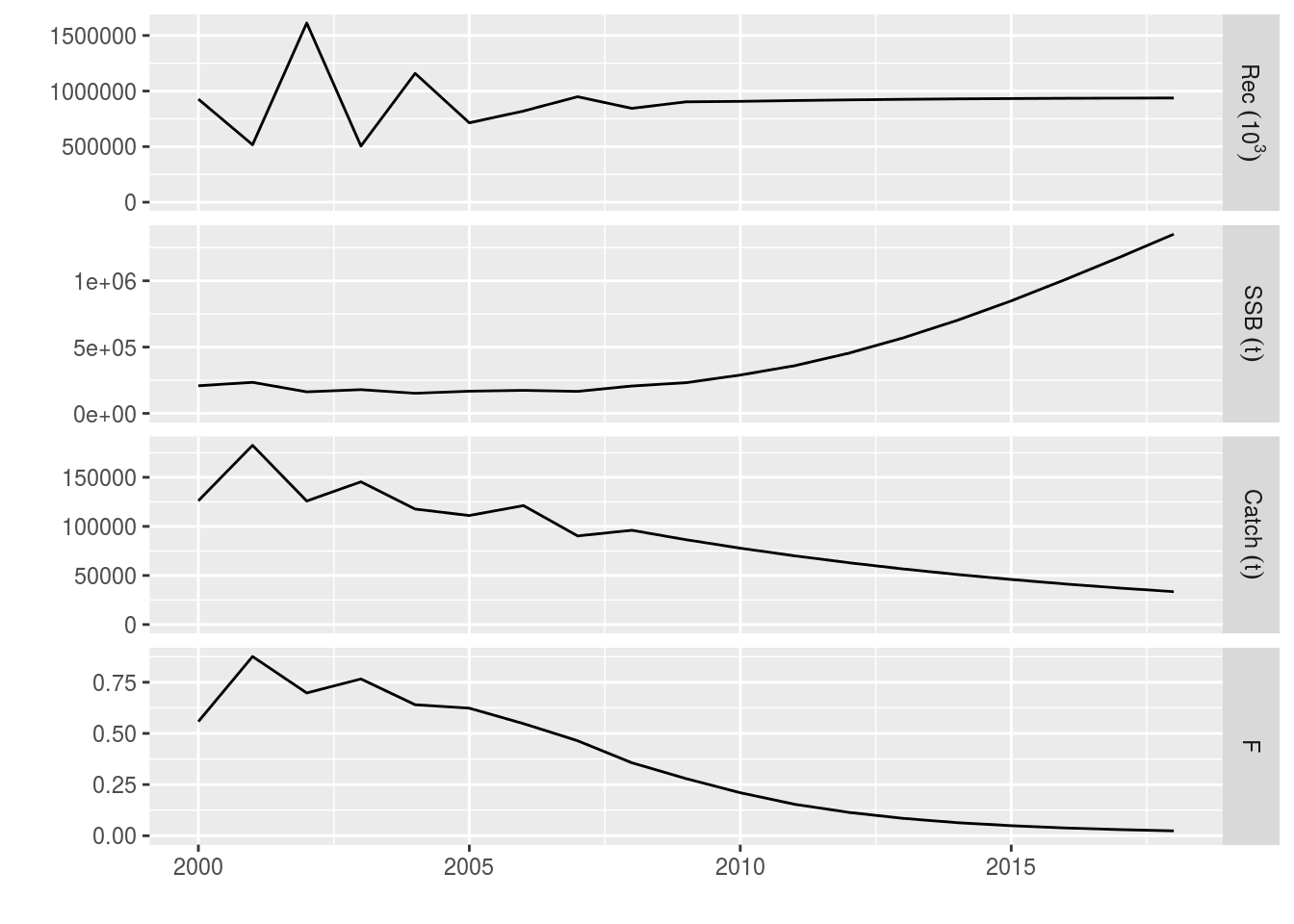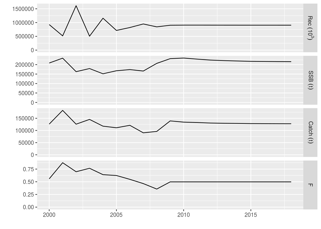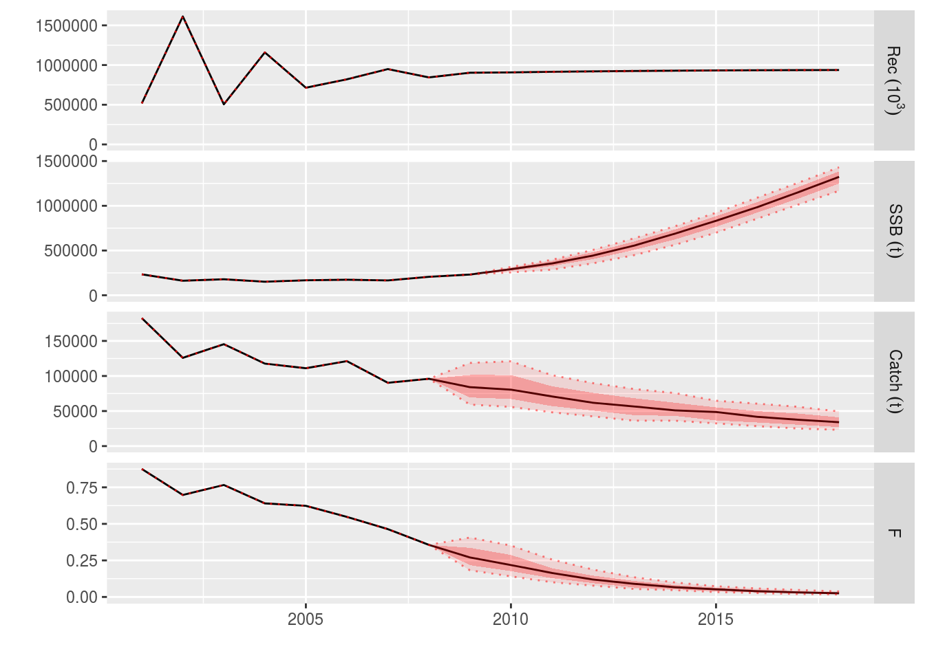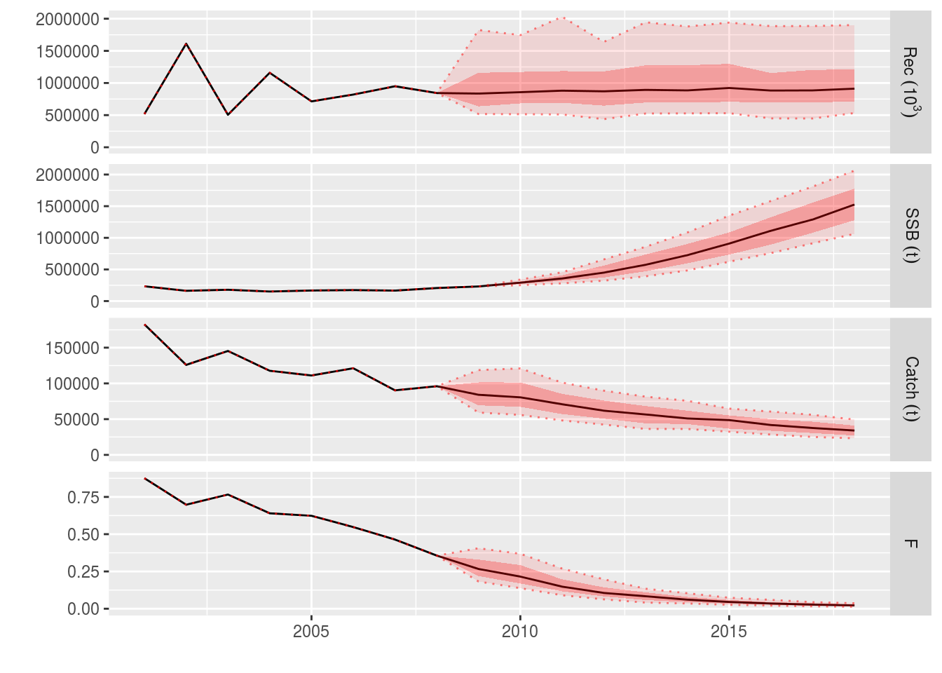 ple4_stoch_rec <- fwd(ple4_mtf, control = ctrl_catch, sr = ple4_sr, residuals = rec_residuals)