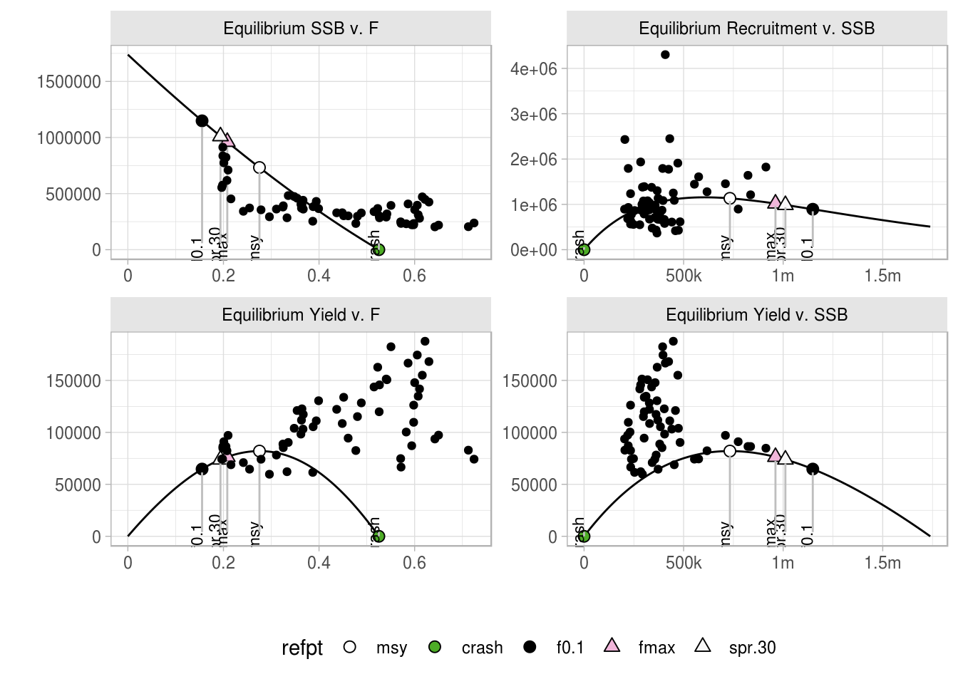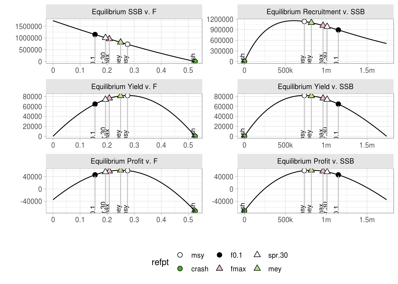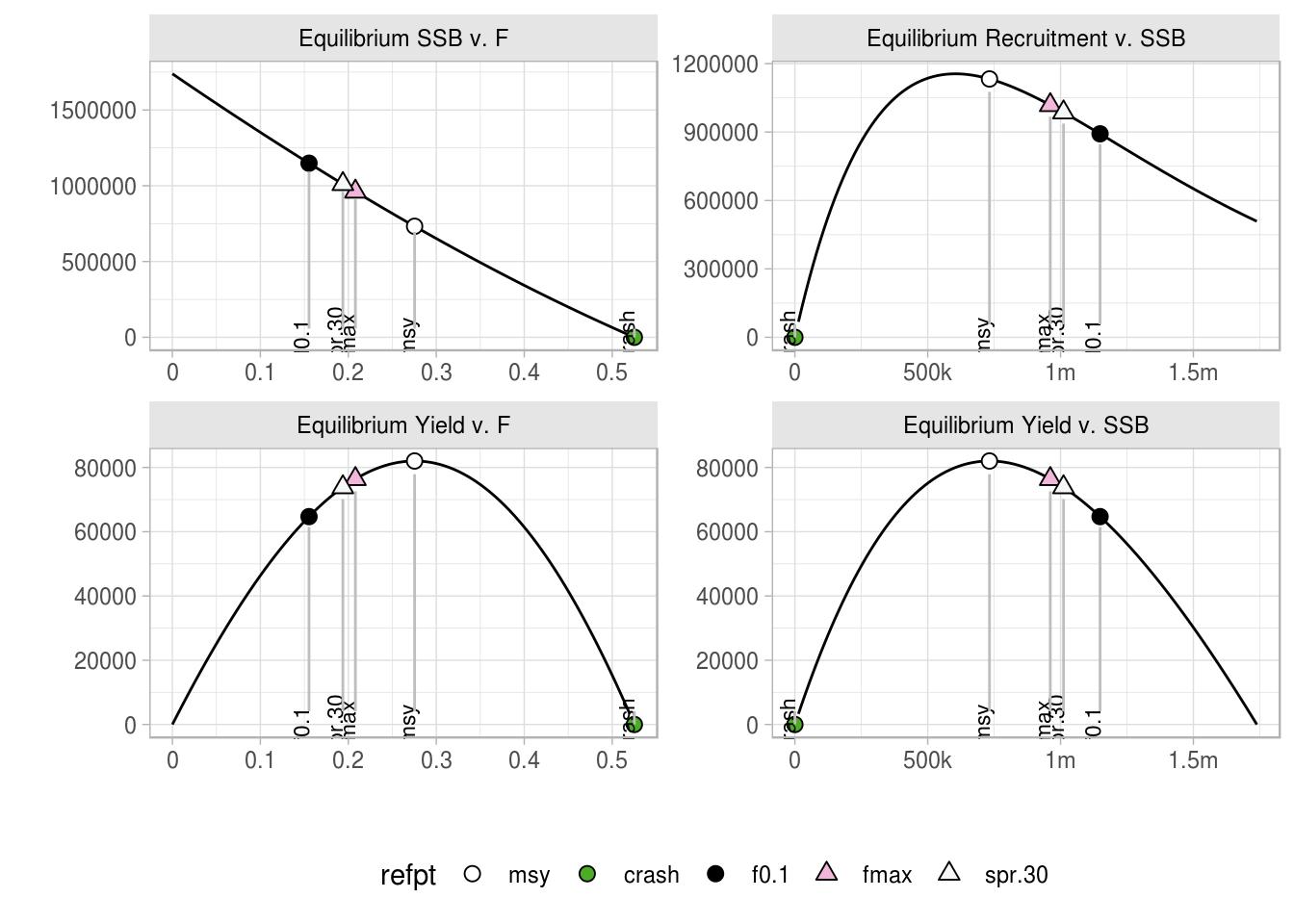 Standard plots are available in FLBRP. The basic plots include the relationships between SSB and F, recruitment and F, yield and F and Yield and SSB at equilibrium. The different reference points are shown on each curve.