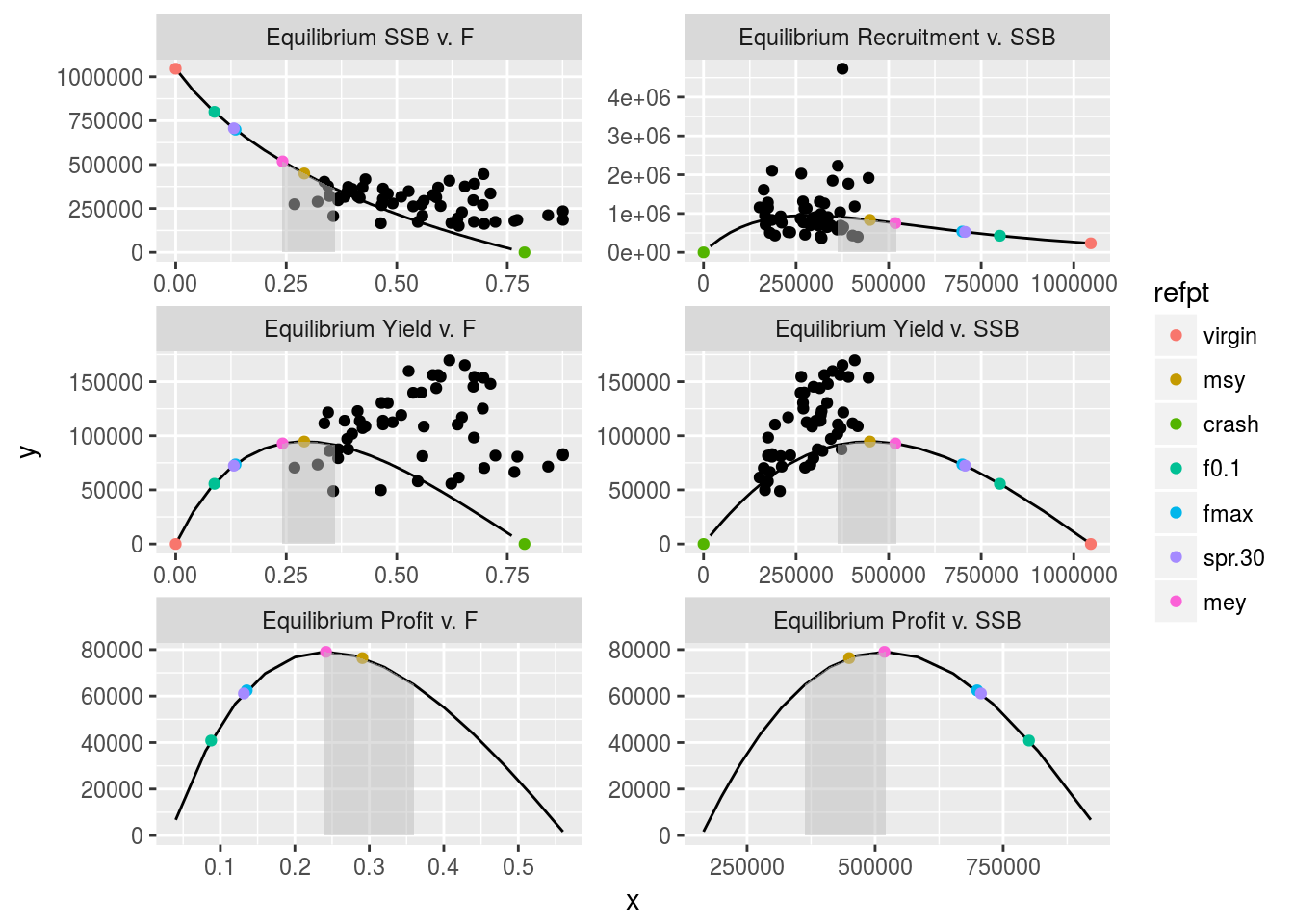 Corresponding assessment estimates of SSB, recruitment and F, as well as observed landings representing “yield” can easily be added to these plots. It should be noted that the curves and associated reference points in these plots represent equilibrium states, whereas the assessment estimates and observations are non-equilibrium. Furthermore, F will always represent total catch (landings and discards), whereas the “yield” is only that portion of the catch that one would desire to optimise (i.e. landings) - so effectively one is looking for the F (total catch) that will optimise the yield (landings only) when estimating MSY reference points.